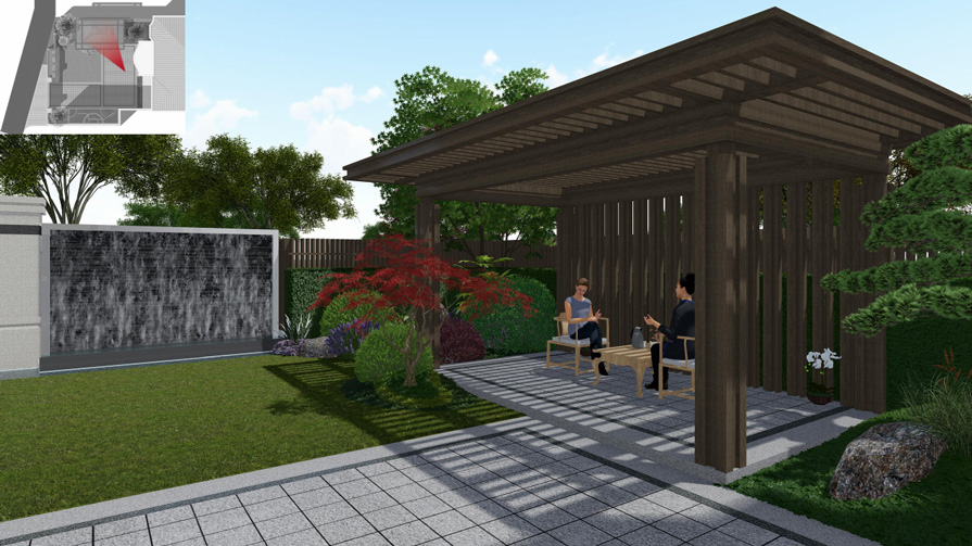 信陽別墅庭院由袁瑩瑩設計,客戶要求花園要有休息的涼亭,庭院的空間要相對封閉,有一個屬于自己的獨處環境。