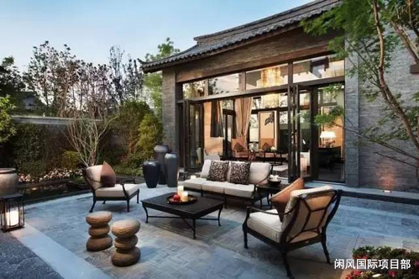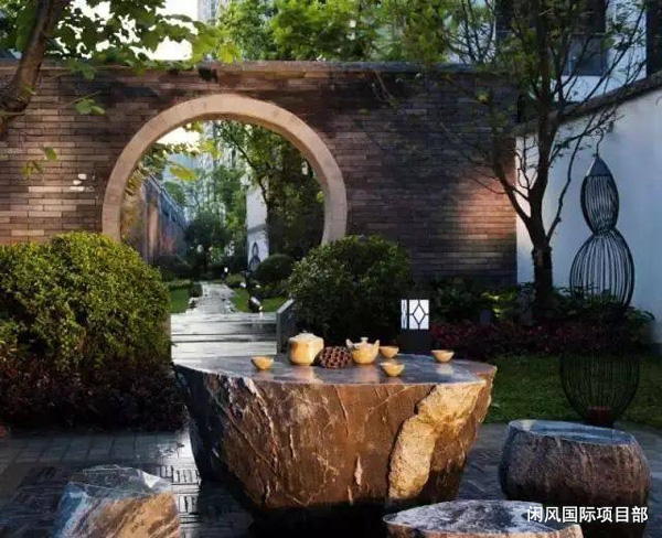 3、色彩空間,交相輝映:中式庭院設計中的布局比例,和色彩質感很能體現別墅的外在風格。庭院中的燈光、椅子、大門、花草等細節的處理。外加空間布局和色彩質感的處理就能構成庭院景觀的整體布局和藝術感染力。